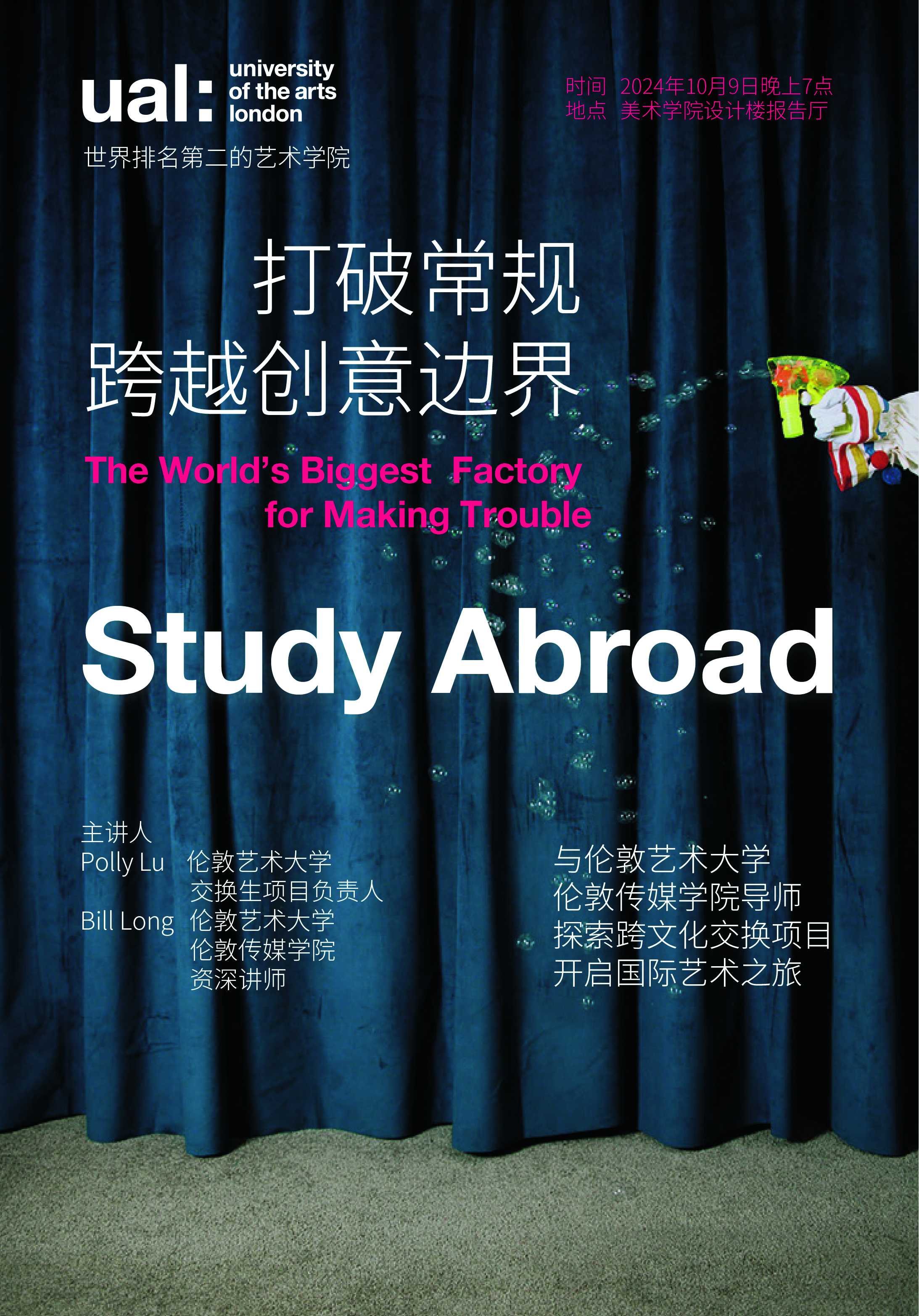 (通讯员 胡梦涵)10月9日晚7点,“打破常规,跨越创意边界”伦敦艺术大学交换生项目讲座在我院设计楼报告厅举办。本次讲座由伦敦艺术大学交换生项目负责人Polly Lu、伦敦艺术大学伦敦传媒学院资深讲师Bill Long主讲,伦敦艺术大学交流游学项目中国合作伙伴汤子慕老师、院教务办主任张禹蕲老师、院团委书记唐士晋老师及2024级全体本科生出席。