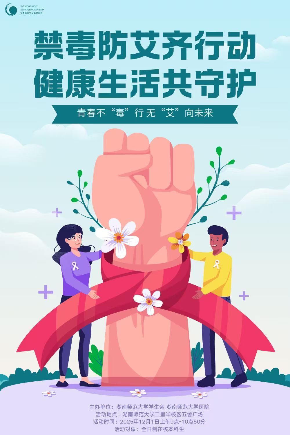12月1日上午,“禁毒防艾齐行动,健康生活共守护”系列活动启动仪式暨防艾禁毒科普专家讲座在湖南师范大学二里半校区五舍广场正式拉开序幕。校相关领导为防艾禁毒志愿者代表授旗。启动仪式后,湖南省疾病预防控制中心专家应邀开展专题讲座,围绕艾滋病传播途径、青年学生防护要点、新型毒品辨识与危害等主题进行系统讲解,帮助学生掌握科学防护知识。启动仪式当日中午,学院同步举办了防艾禁毒知识竞赛。竞赛内容涵盖艾滋病基本知识、预防措施、法律法规和毒品危害等方面,通过闭卷答题方式检验学生对讲座内容的理解与掌握程度,最终推选出1名代表参加校级决赛。