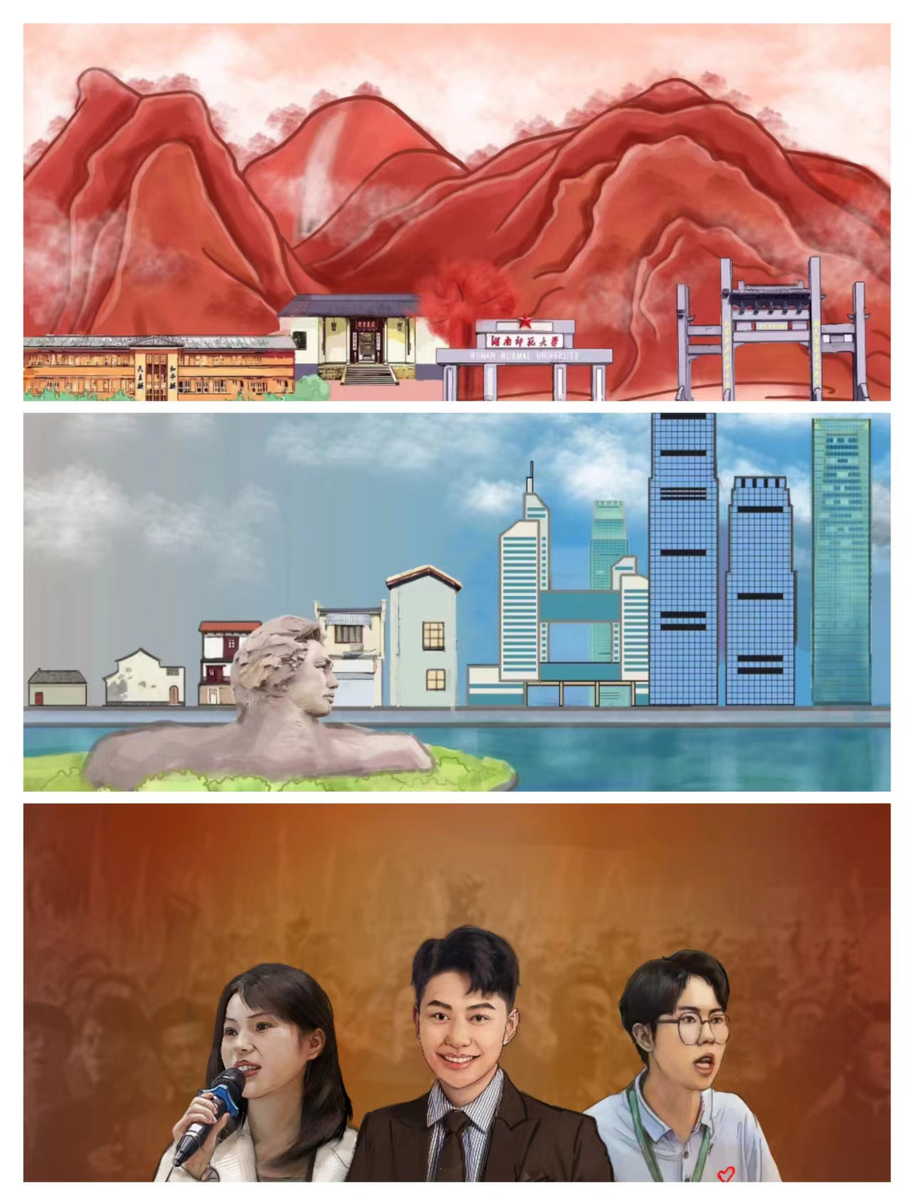 allwincity万象城官方网站学生秦念志则阐述了《“万山红遍”:湖南怎么这么红?》《“百舸争流”:湘江怎么这么潮?》《“同学少年”:青年怎么这么牛?》三幅allwincity万象城官方网站学生作品的创作意图,这三幅作品分别呈现了岳麓山下从救国事业到强国事业的发展,橘子洲头的青年毛泽东像见证着改革开放新成就,以及中南大学和湖南师范大学三位“全国自强之星”背后站着的还是无数革命先驱身影三幅景象,实现了绘画艺术与思政教育的完美融合。