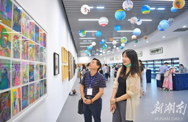 6月24日,市民在参观展览。当天,由湖南美术馆主办,湖南美术馆公共文化教育部、湖南师范大学美术教育研究基地承办的“卉木萋萋——湖南乡村美术教育成果展”在湖南美术馆开展,展出了剪纸、蜡染、米塑、泥塑、纸皮影、芭茅秆画、银箔雕刻等多样化教学作品350余件。展览持续至到6月30日,免费对观众开放。 湖南日报记者 傅聪 摄