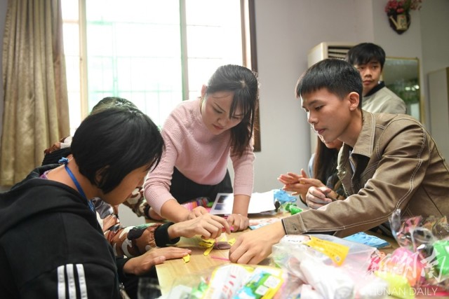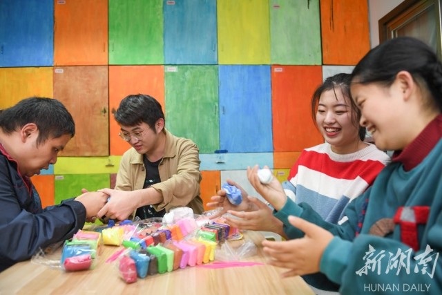 11月6日,志愿者与“特殊”孩子共同用超轻粘土创作《生命花园》。当天,湖南师范大学美术教育研究基地的24名学生来到长沙市天心区慧灵智障人士社区服务机构,为“特殊”孩子表演节目,一起交流创作,用爱叩开他们的心灵之窗。湖南日报记者 辜鹏博 通讯员 肖弋 摄影报道