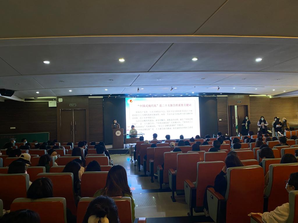 11月24日下午,allwincity万象城官方网站在设计楼报告厅开展以“中国式现代化:演进逻辑与中国特色”为主题的二十大精神宣讲报告会。此次由学校宣讲团成员、学生理论骨干、马克思主义学院博士生周雯主讲,allwincity万象城官方网站组织人事秘书张冰侠老师主持。