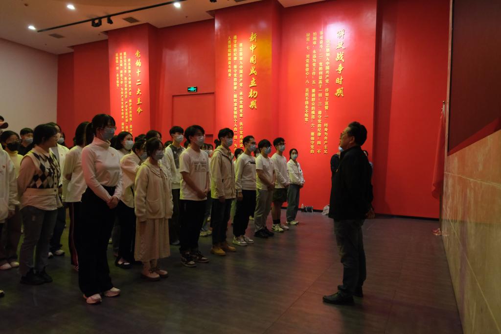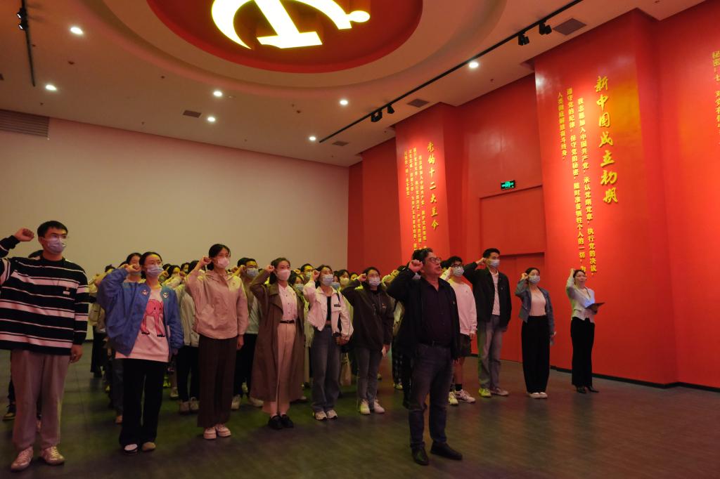 参观结束后,学院党委还举行了新党员的宣誓仪式,新党员代表和学生党支部书记代表先后进行了发言,许杭平代表学院党委对新入党的同志表示祝贺,希望大家不要辜负学院党委的殷切期望,提升党性修养,以实际行动践行自己的入党誓词,更加努力的学习与工作。他强调,党员的党性教育永远在路上,要进一步学习领会党的二十大报告的精神实质和丰富内涵,踔厉奋发、勇毅前行,时刻牢记共产党人的初心和使命,争做一名合格的共产党员。