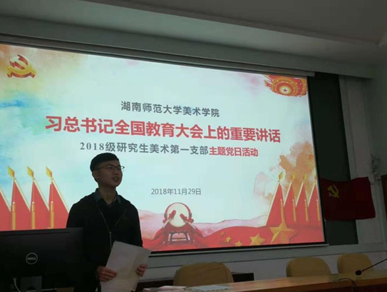 (通讯员 颜璐)2018年11月29日下午,2018级研究生美术第一党支部于美术楼115召开“全国教育大会精神学习贯彻”主题党日活动。会议由党支部书记汤顺鑫主持。
