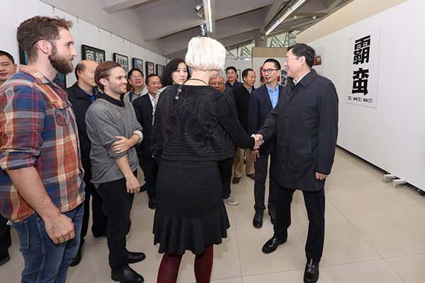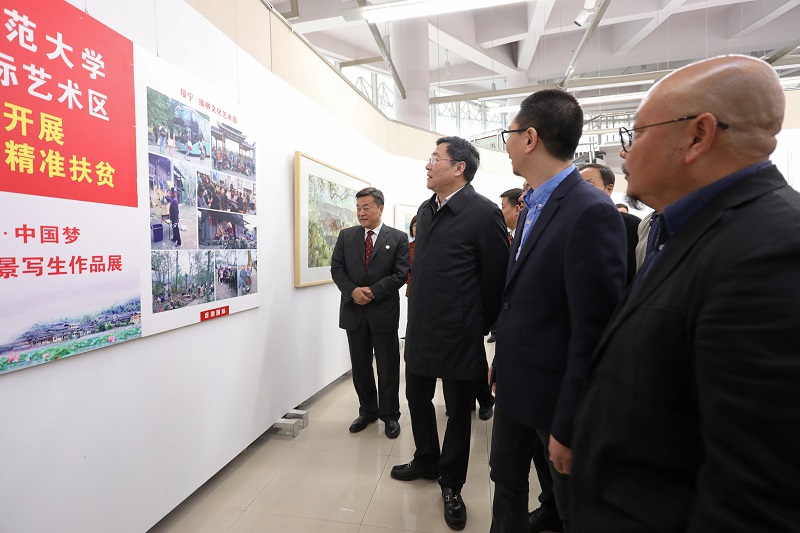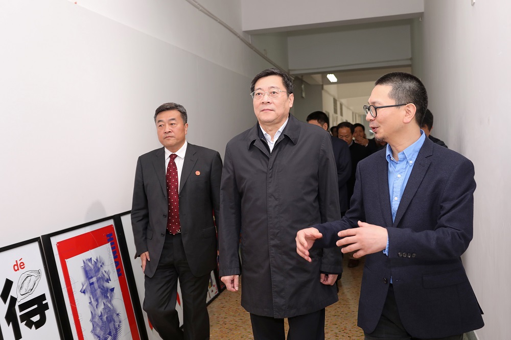 杜家毫重点参观了我院的名人古画展、教师作品展、“湖湘风华”文化海报设计作品展、艺术教育精准扶贫插柳写生作品展以及服务地方经济发展的文化创意设计产品展,他认真欣赏、仔细察看、不时询问。他对我院学生制作的文创产品颇感兴趣,院长李少波向他介绍了我院师生用设计创新服务地方经济发展的情况。他还与我院的外籍教师进行了交流,了解他们在学校的教学、生活情况。