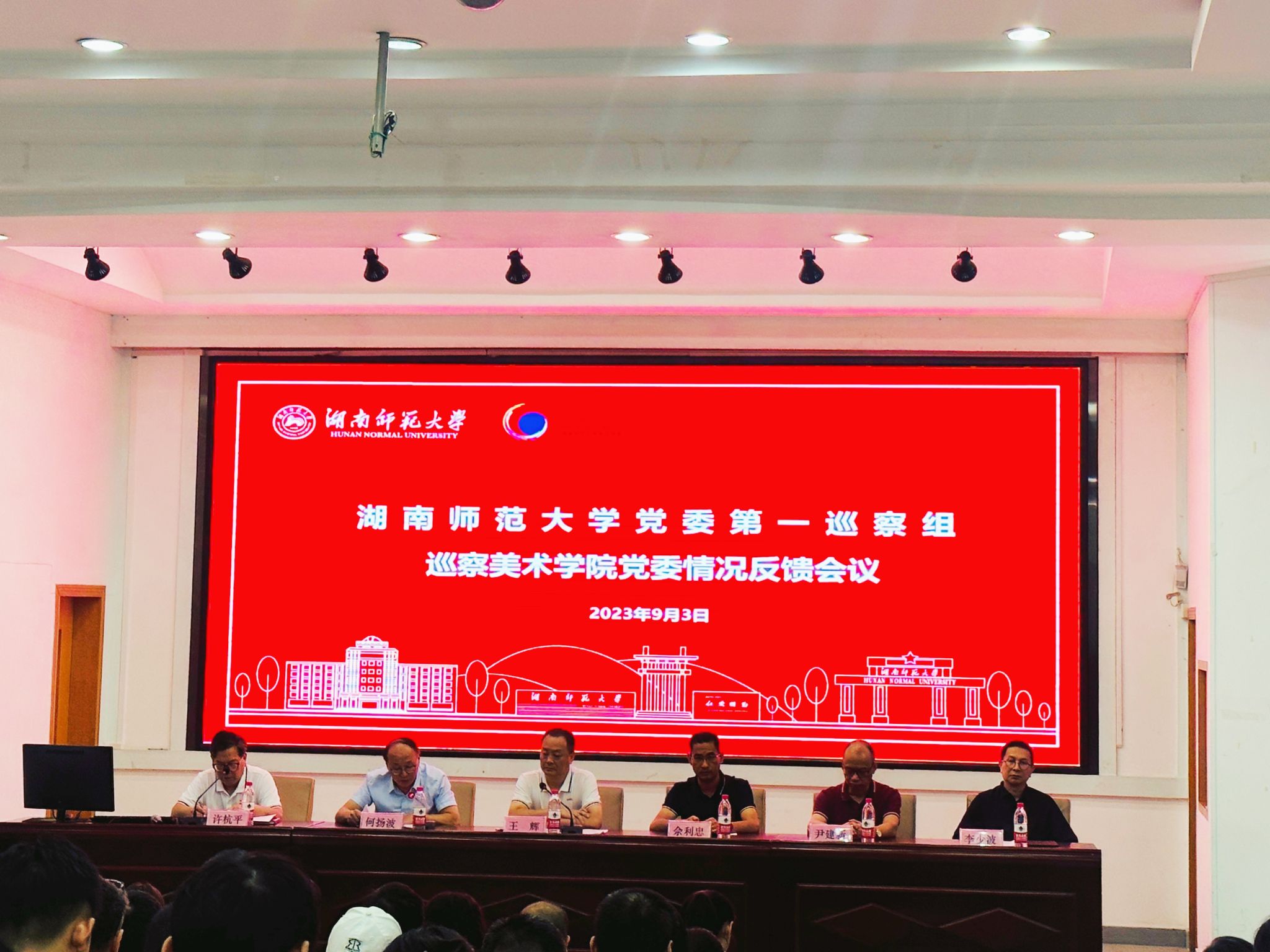 根据湖南师范大学党委巡察工作统一部署,2023年9月3日下午,党委第一巡察组在allwincity万象城官方网站美术楼115教室召开党委巡察情况反馈会议。校党委委员、副校长王辉,党委第一巡察组组长何扬波、副组长尹建新、党委巡察办专职副主任佘利忠出席会议,学院党委书记许杭平主持会议。