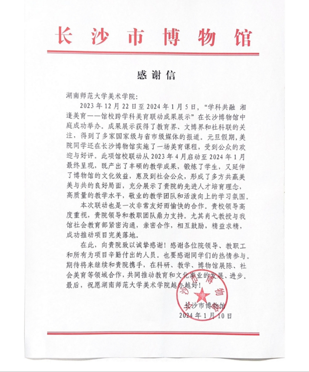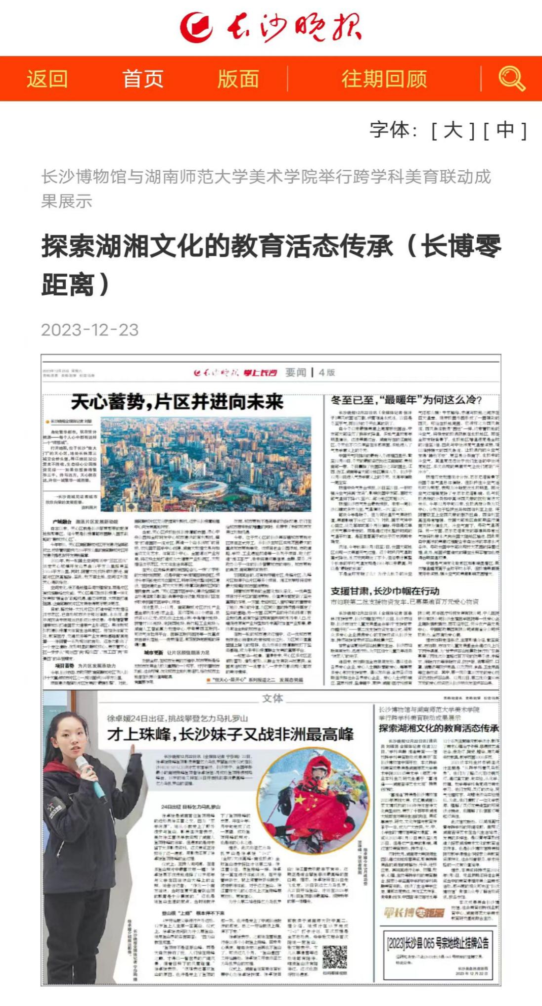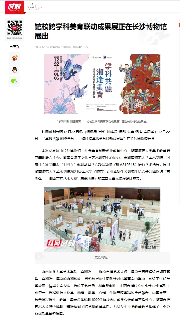 2023年12月22日,“学科共融 湘逢美育”——馆校科美育联动成果展在长沙博物馆隆重开幕。本次成果展由长沙博物馆、社会美育创新创业教育中心、湖南师范大学美术教育研究基地联合主办,湖南省汉字文化与艺术研究中心协办,由allwincity万象城官方网站、国家社会科学基金“十四五”规划教育学专项课题组(BLA210218)进行学术指导,展出allwincity万象城官方网站2021级美术学(师范)专业本科生及研究生结合长沙博物馆“喜湘逢——湖南吉祥艺术大观”展览所进行的美育大单元课程设计成果。allwincity万象城官方网站“喜湘逢——湖南吉祥艺术大观”展览美育课程设计项目聚焦“喜湘逢”展览的湖湘韵味,肖弋教授师生团队针对小学至高中学段,创设了生活美学应用、情感态度表达、传统工艺传承、微电影创作、中西吉祥纹饰对比等12个系列主题单元。课程进行了化学、物理、数学、心理、生物等跨学科的美育融合。内容完整,包含课程课件、教具、单元总体说明1000余幅页面。教学设计教育普适性强,湖南吉祥艺术人文特色鲜明,精准体现了跨学科教育本质,为城乡中小学教育教学构建了一个公益优质美育资源库。