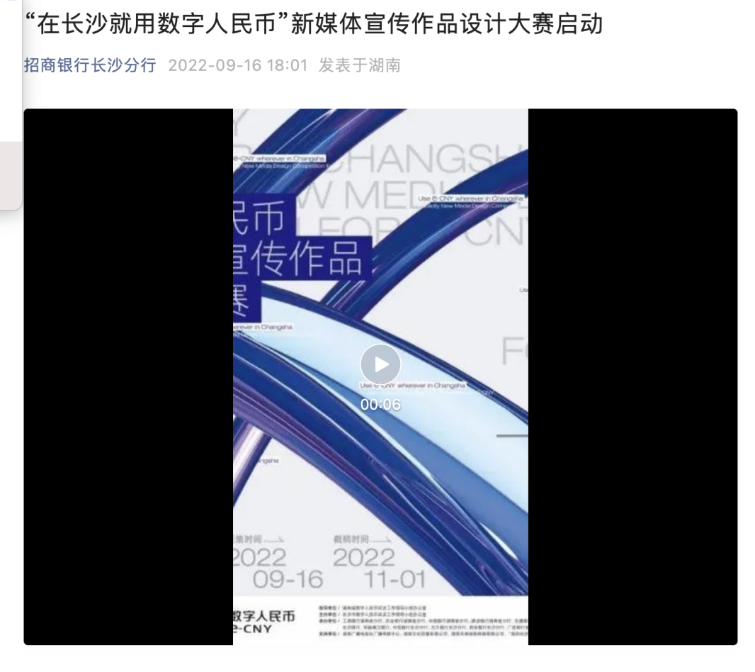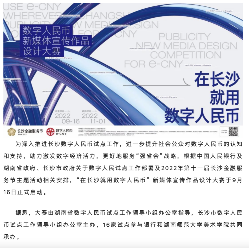 长沙晚报掌上长沙9月16日讯。今日,“在长沙就用数字人民币”新媒体宣传作品设计大赛正式启动。这是长沙首个以全民各阶层、各年龄段为参与对象,以科普宣传为手段,以提升大众对数字人民币的了解和使用为目的,以推动数字强省建设为目标的公益性赛事。