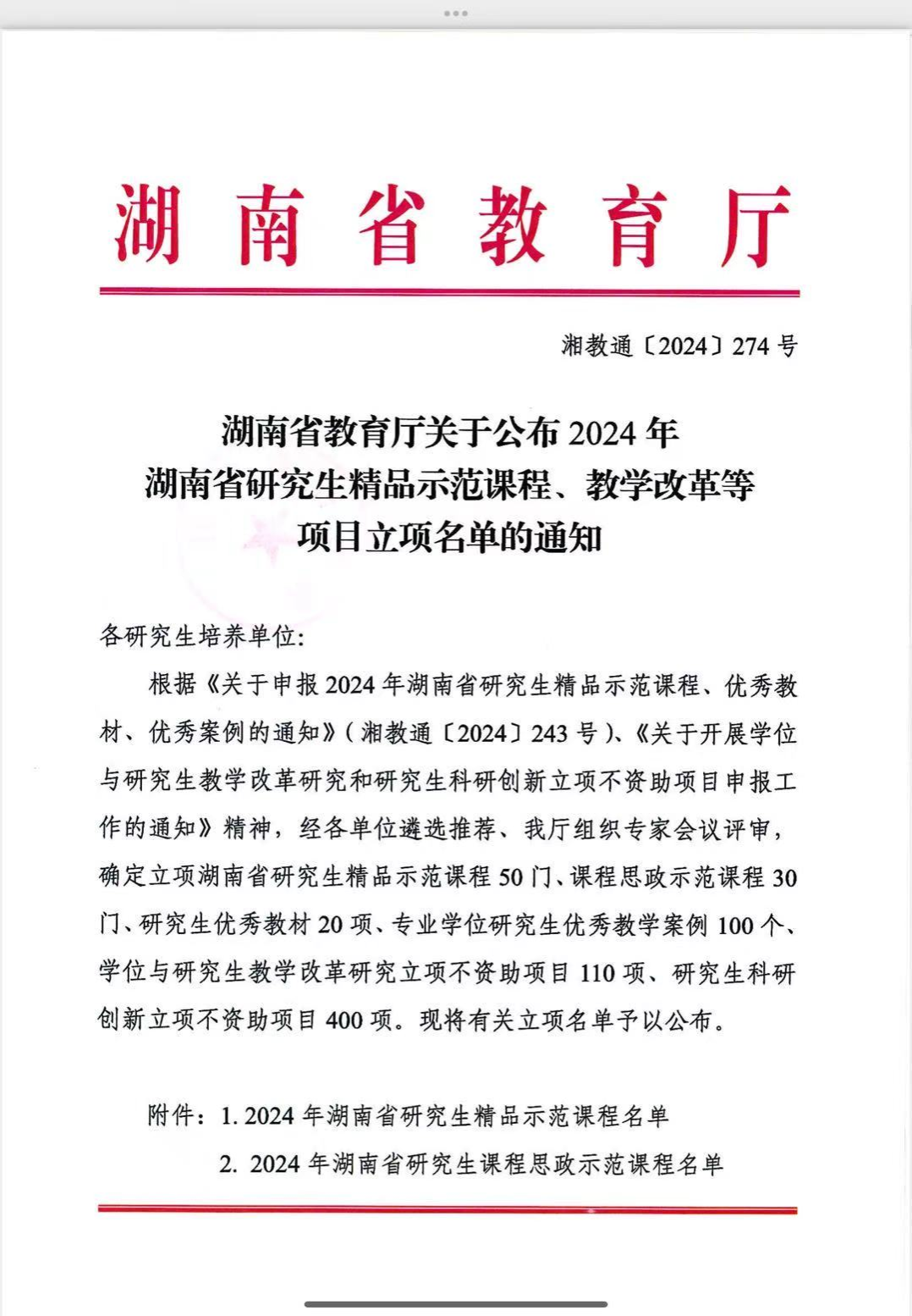 2024年湖南省研究生精品示范课程、教学改革等项目立项