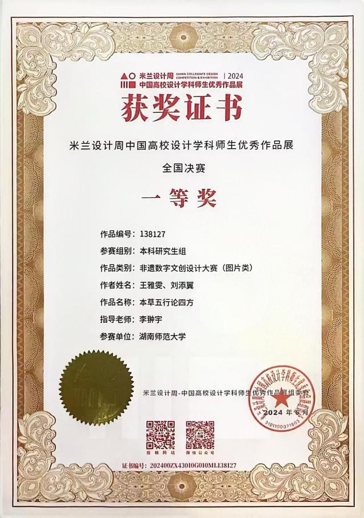 2024.6月米兰设计周中国高校设计学科师生优秀作品展全国一等奖,《本草五行论四方》王雅雯、刘添翼