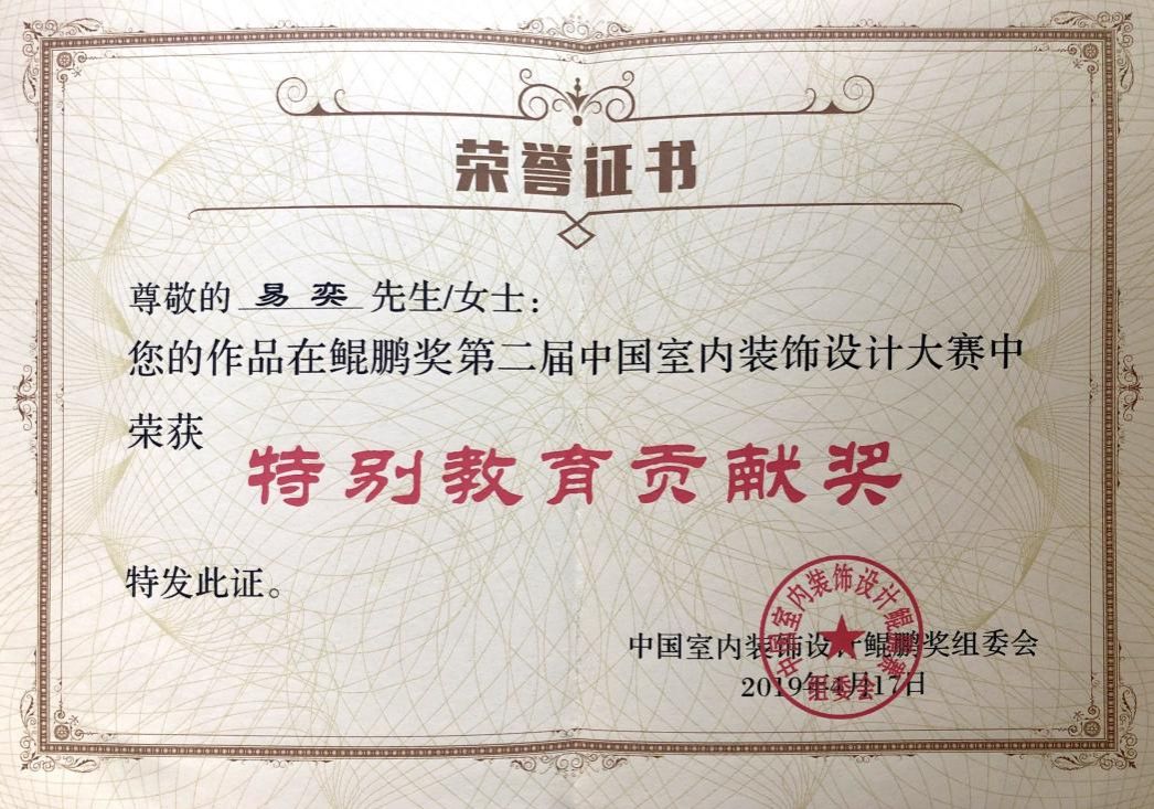 2019年鲲鹏杯特别教育贡献奖。授奖单位:中国室内装饰设计鲲鹏奖组委会